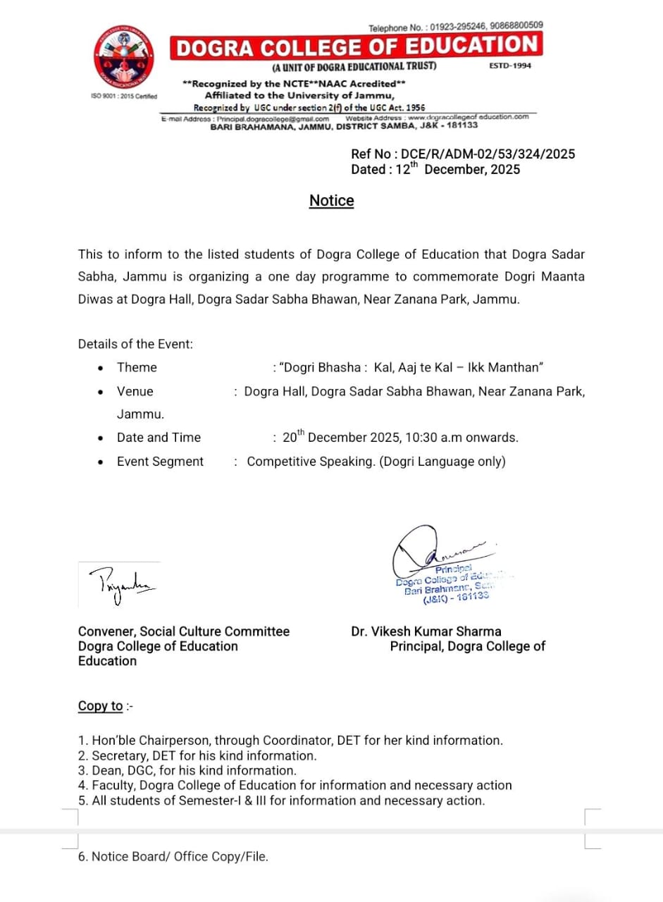 One day Programme organized by Dogra Sadar Sabha to commemorate Dogri Maanta Diwas at Dogra Hall, Dogra Sadar Sabha Bhavan on 20.12.2025.